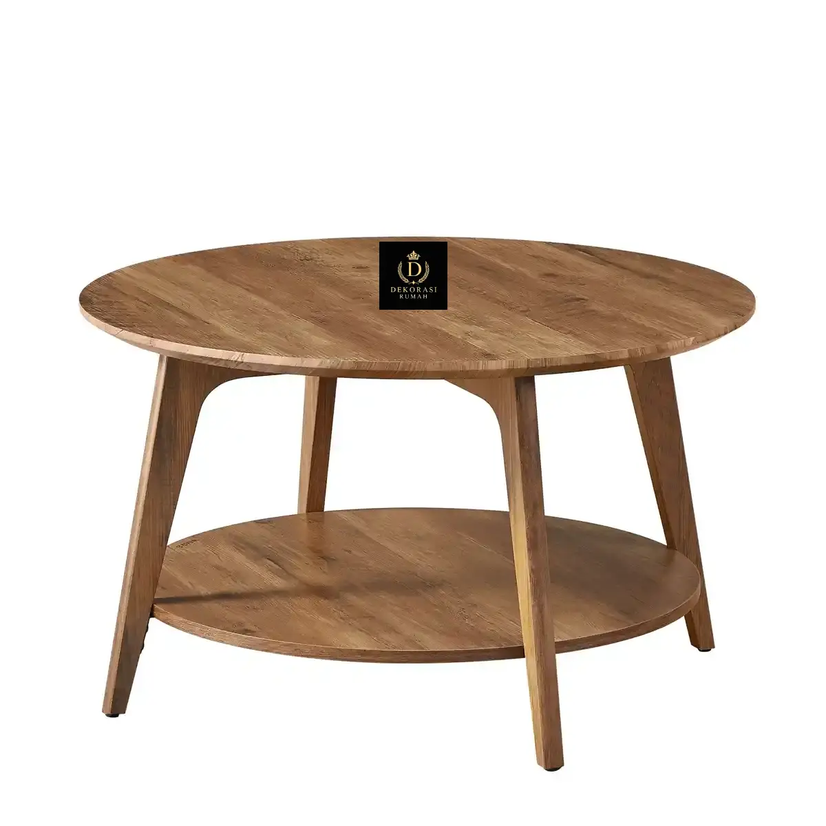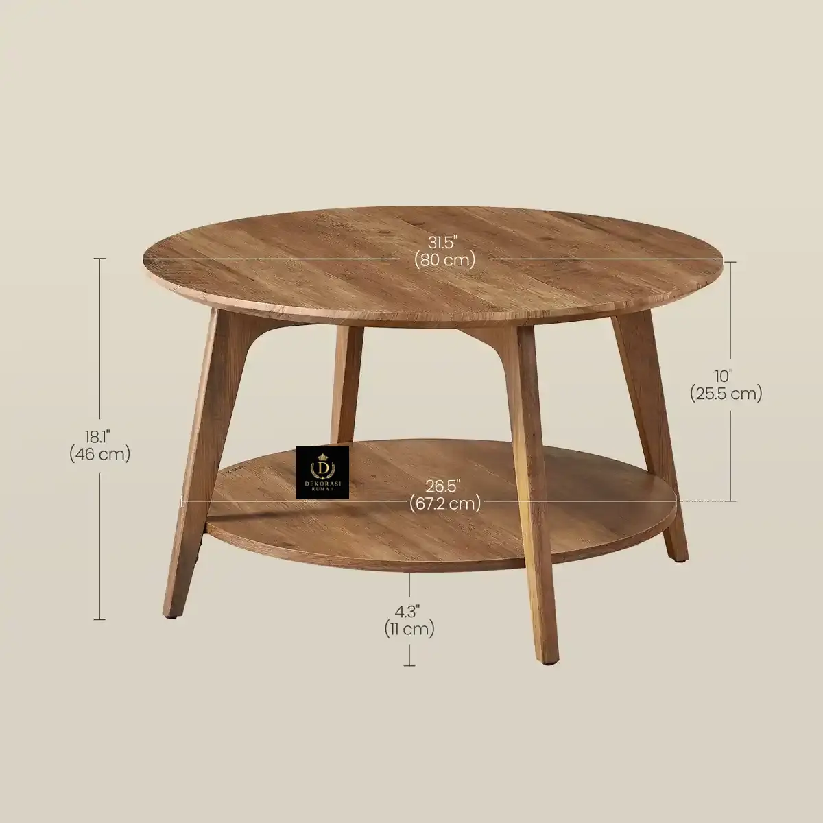 Strukturnya didukung oleh empat kaki kayu yang sedikit meruncing, menciptakan kesan ringan namun tetap kokoh. Dilengkapi dengan rak terbuka berbentuk melingkar di bagian bawah, meja kopi ini menawarkan dua tingkat permukaan yang fungsional untuk memajang dekorasi atau menyimpan majalah dan kebutuhan harian. Selain itu, permukaannya dirancang tahan gores dan noda, menjadikannya pilihan ideal untuk rumah dengan aktivitas tinggi.