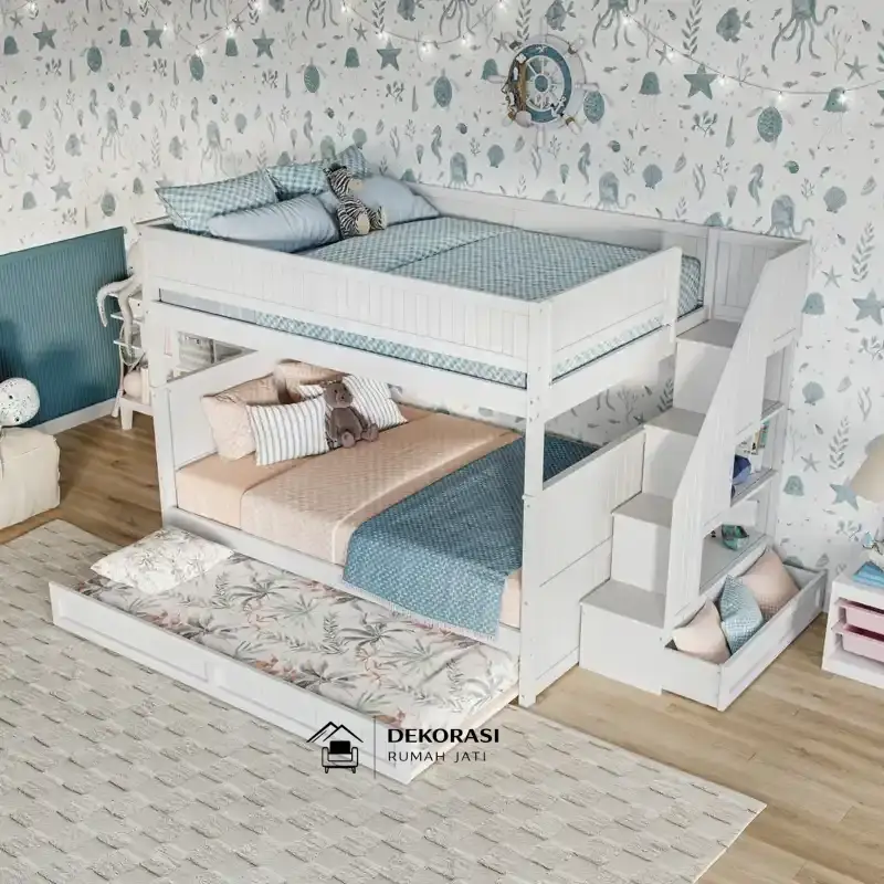 Keunggulan utamanya terletak pada tangga bawaan multifungsi yang dilengkapi rak dan laci penyimpanan, membantu menjaga kamar tetap rapi sekaligus memudahkan anak naik turun dengan aman. Ditambah lagi, ranjang trundle ukuran Twin memberikan ruang tidur ekstra—sempurna untuk tidur bersama saudara atau menginapnya teman.